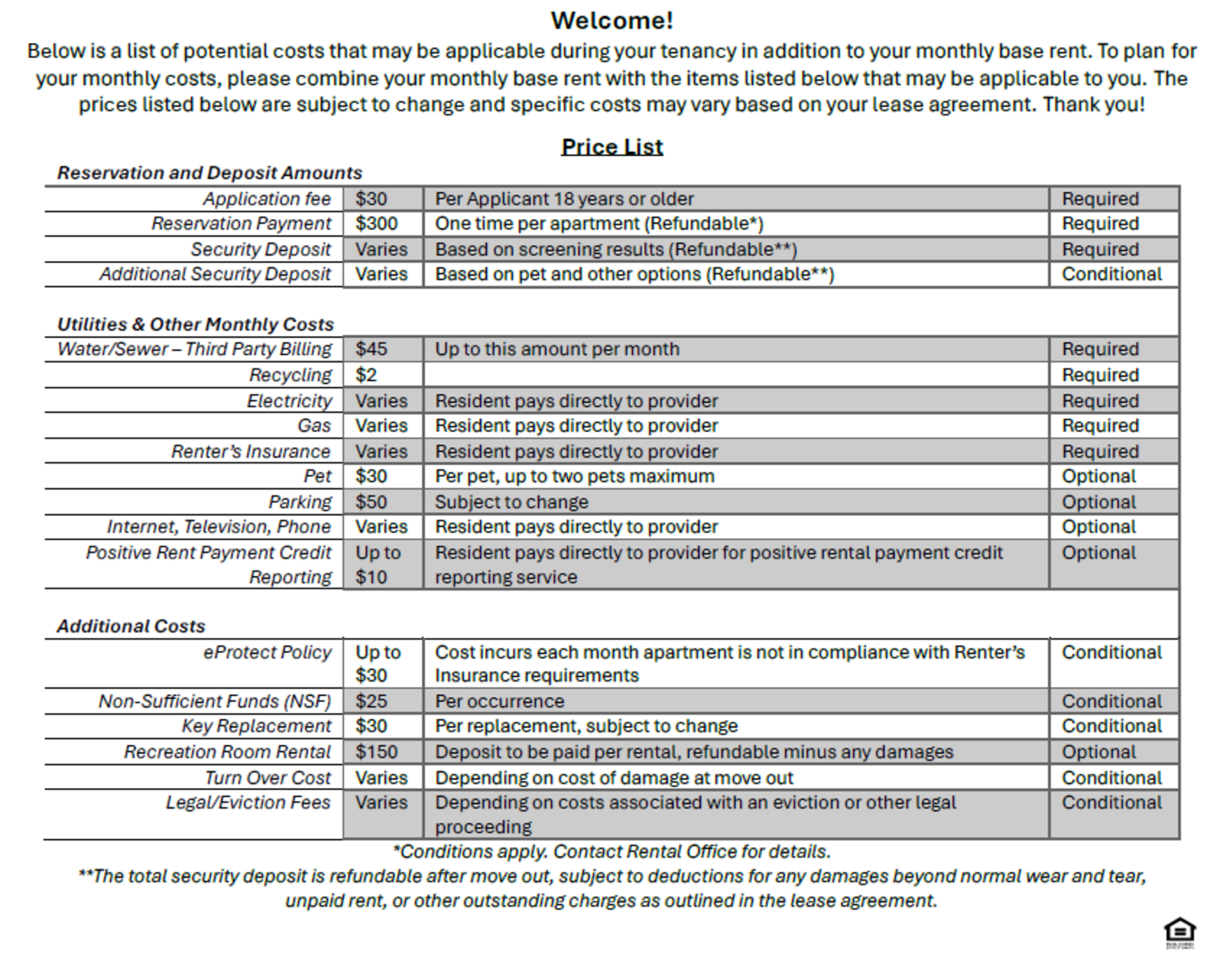 Price shown is Base Rent. Residents are required to pay the following: Application Fee ($30.00 Per Applicant 18 years or older, One-Time, At Application), Reservation Payment ($300, One time per apartment, Refundable*), Security Deposit (Varies, Based on screening results, Per Apartment, Refundable**), Additional Security Deposit (Varies, Based on pet and other options, Refundable**, Water/Sewer (Up to $55 per month per apartment, Utility, Usage Based, Nonrefundable), Recycling ($2 per month per apartment, if applicable, Nonrefundable), Electricity/Gas (Varies, Usage Based, Utility, Resident pays directly to provider), Renter’s Insurance (Varies, Resident pays directly to provider). Optional charges that may be applicable to the resident are as follows: Pet ($30 Per pet per month, Up to two pets maximum, Nonrefundable), Parking/Carport/Garage/Storage (Varies per property, per month, Subject to change, Nonrefundable, Refundable** deposit may apply), Internet, TV, Phone (Varies, Utility, Resident pays directly to provider), eProtect Policy (Up to $30, Cost incurs each month apartment is not in compliance with Renter’s Insurance requirements, Nonrefundable), Non-Sufficient Funds (NSF) ($25 Per occurrence, Nonrefundable) Key/FOB/Remote Replacement (Varies per property, Per replacement, Subject to change, Nonrefundable), Positive Rental Payment Credit Reporting ($2.00 per month per resident, Resident pays directly to CredHub, Nonrefundable), Turn Over Cost (Varies, Depending on cost of damage at move out), Legal/Eviction Fees (Varies, Depending on costs associated with an eviction or other legal proceeding). *Conditions apply. Contact Rental Office for details. **The total security deposit is refundable after move out, subject to deductions for any damages beyond normal wear and tear, unpaid rent, or other outstanding charges as outlined in the lease agreement.